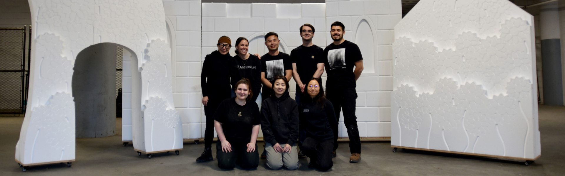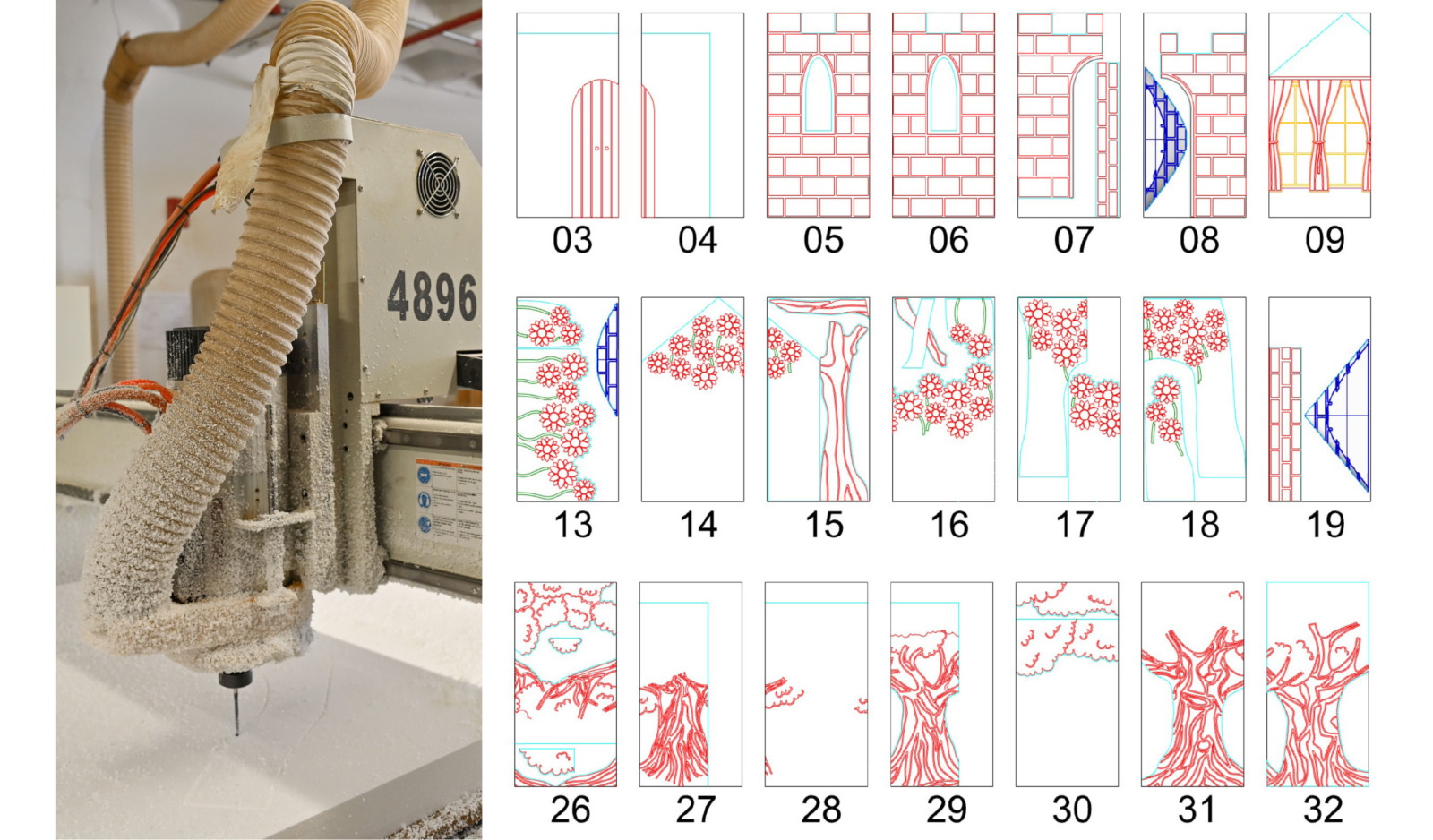 These sets were CNC cut on 4×8’ polystyrene panels at PAYETTE’s fabrication lab prior to the day of service. Each cut file was unique and processed through a routing software. The designs were translated into line work before being processed for the CNC. In total 32 panels were scored, carved and cut to create the pieces of the set.