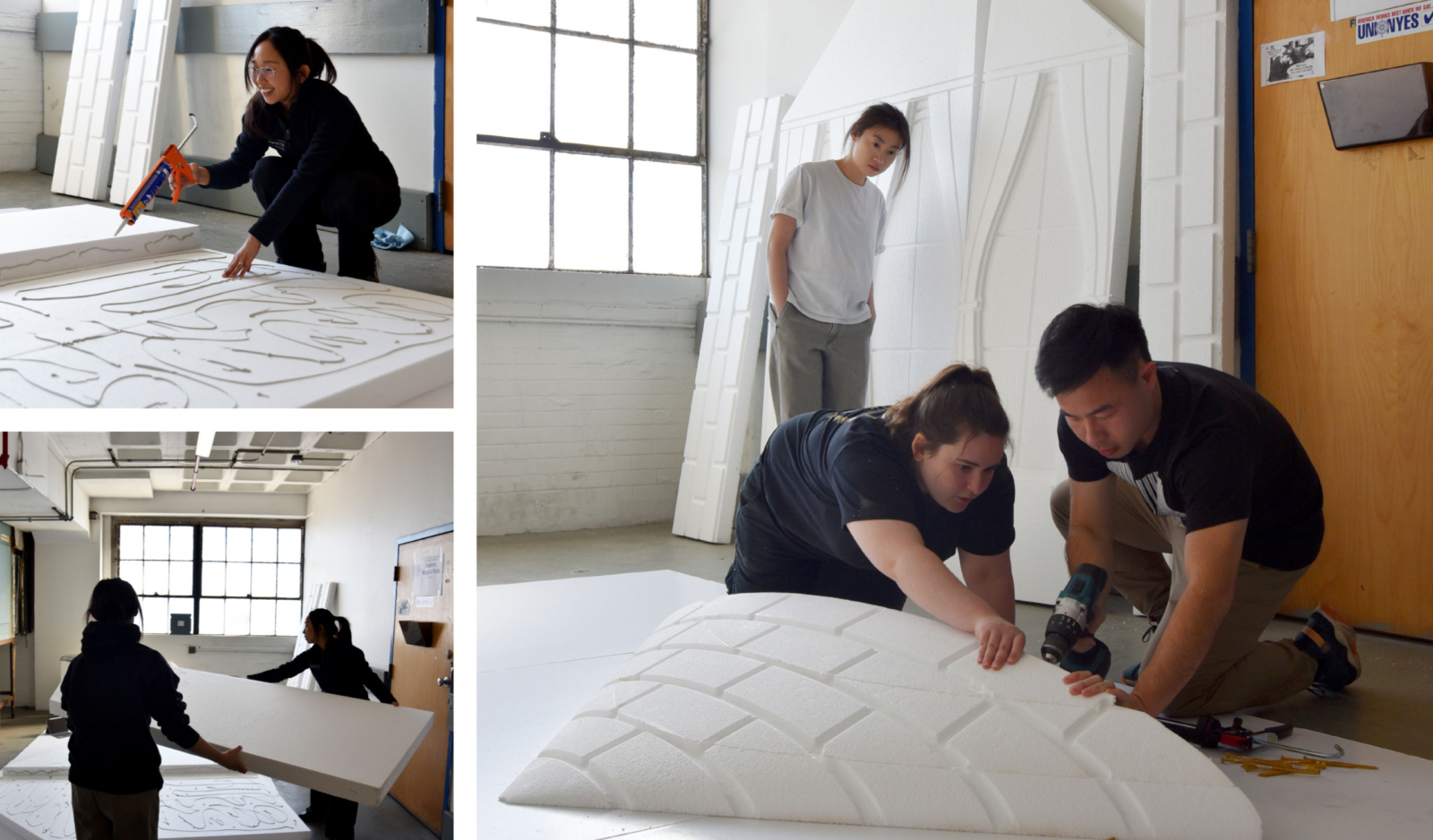 First, the pieces were thoroughly cleaned and dusted of any remaining particles from the cutting process. The pieces were then dry-fitted to validate their position before gluing them together. Using caulk guns, a construction adhesive was applied to the pieces. Sections of each set were then sandwiched together with adhesive between them, and we secured the assembly with screws connecting the different layers. Each set piece (double sided) is four or five sheets of polystyrene thick, allowing for depth within the design, not just a flat backdrop.