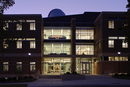 Completed in 2010, the Wheaton College Science Center created a new home for the sciences on its liberal arts campus of 2000 students. Interdisciplinary teaching and research is at the core of the science programs at Wheaton. Eleven different departments are organized into two wings on four floors. Programs range from dry science functions such as math and computer science to fume hood intensive programs like chemistry. Spaces range in complexity from general purpose classrooms shared among the scientific disciplines to highly specialized core facilities such as an NMR imaging suite and vivarium.