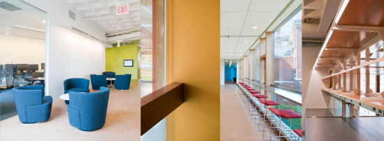 The design of the facility focused on a highly collaborative environment maximizing the number of researchers per square foot. Extensive use of glass allowed for natural light to deeply penetrate the building while maintaining a visual connection to the activity within the laboratory.