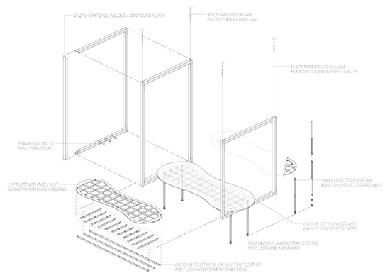 For the Design for Dining project, we used our new fabrication space to build our installation in-house. This architect as fabricator delivery model facilitates an accelerated project schedule, controls costs and guarantees adherence to design intent. As pressures of construction and installation are incorporated into the design process, the digital design model becomes a virtual “shop drawing.” This synthesis allows the team to strategize construction methodology, material procurement and installation procedure simultaneously with design development.
