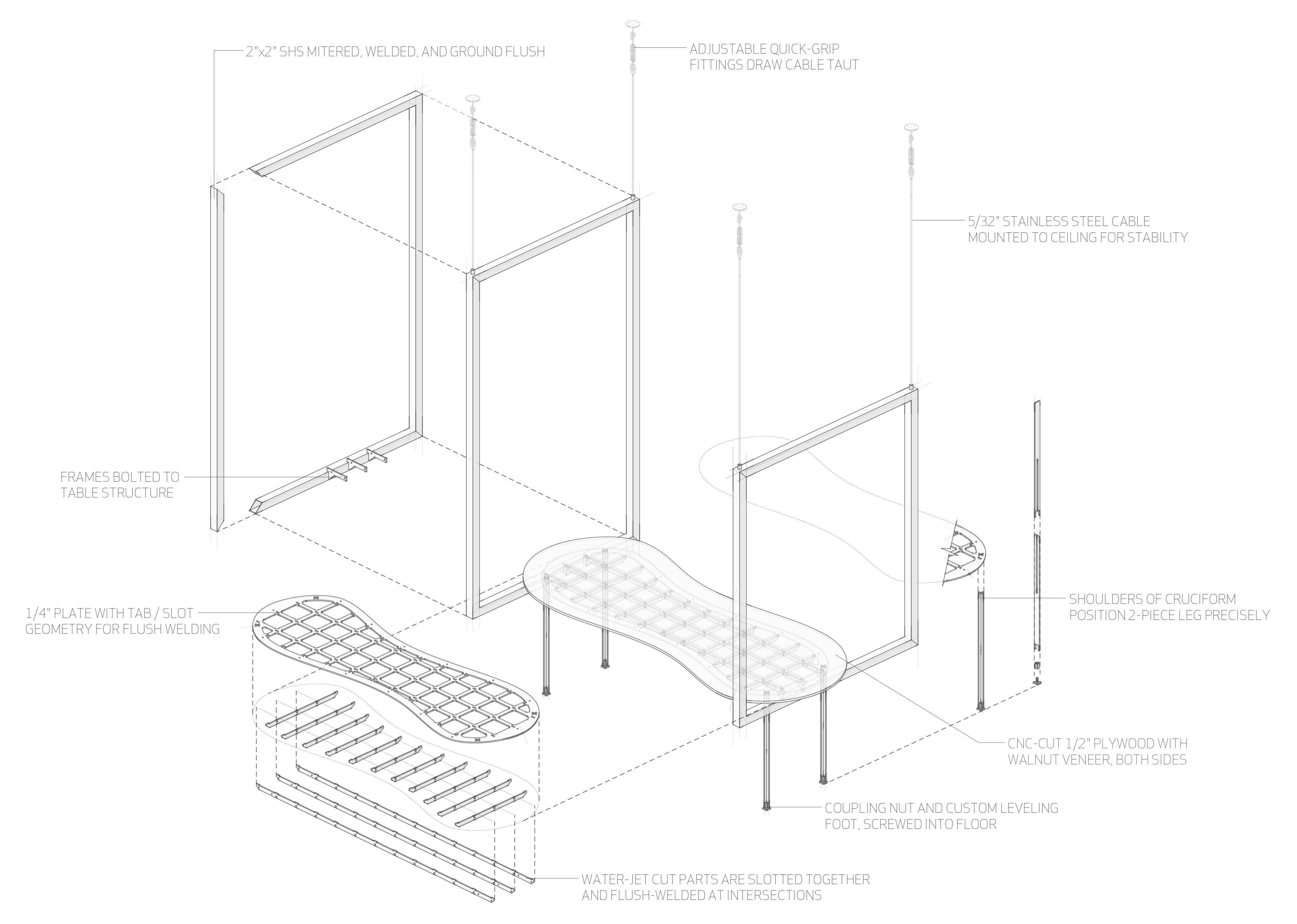 Designing for constructability in the 3D design model streamlined the fabrication process. Slotted parts fit together cleanly, eliminating measurement errors and misalignments that might occur in a more conventional assembly process.