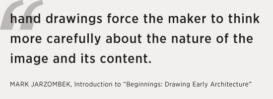 The book for which the drawings were produced explores “the different cultural formations that developed in various places throughout the world to form the built environment.” In his introduction to the exhibit, Jarzombek says he quickly realized his book required hand drawings to illustrate the topics discussed because “hand drawings force the maker to think more carefully about the nature of the image and its content.” The drawings depict site, context and concept from an architectural point of view. The drawings are as much for the book as they are a meditation on the art of drawing by hand to explore ideas. At a time when hand drawing in the field of architecture feels like a lost art, this exhibit and subsequent book highlight the beauty and revelation of hand media. In the exhibition book, Cooke contributed a piece “A Meditation on the Light Table,” exploring the physical relationship of the artist to the light table and its role in the work of reproduction.