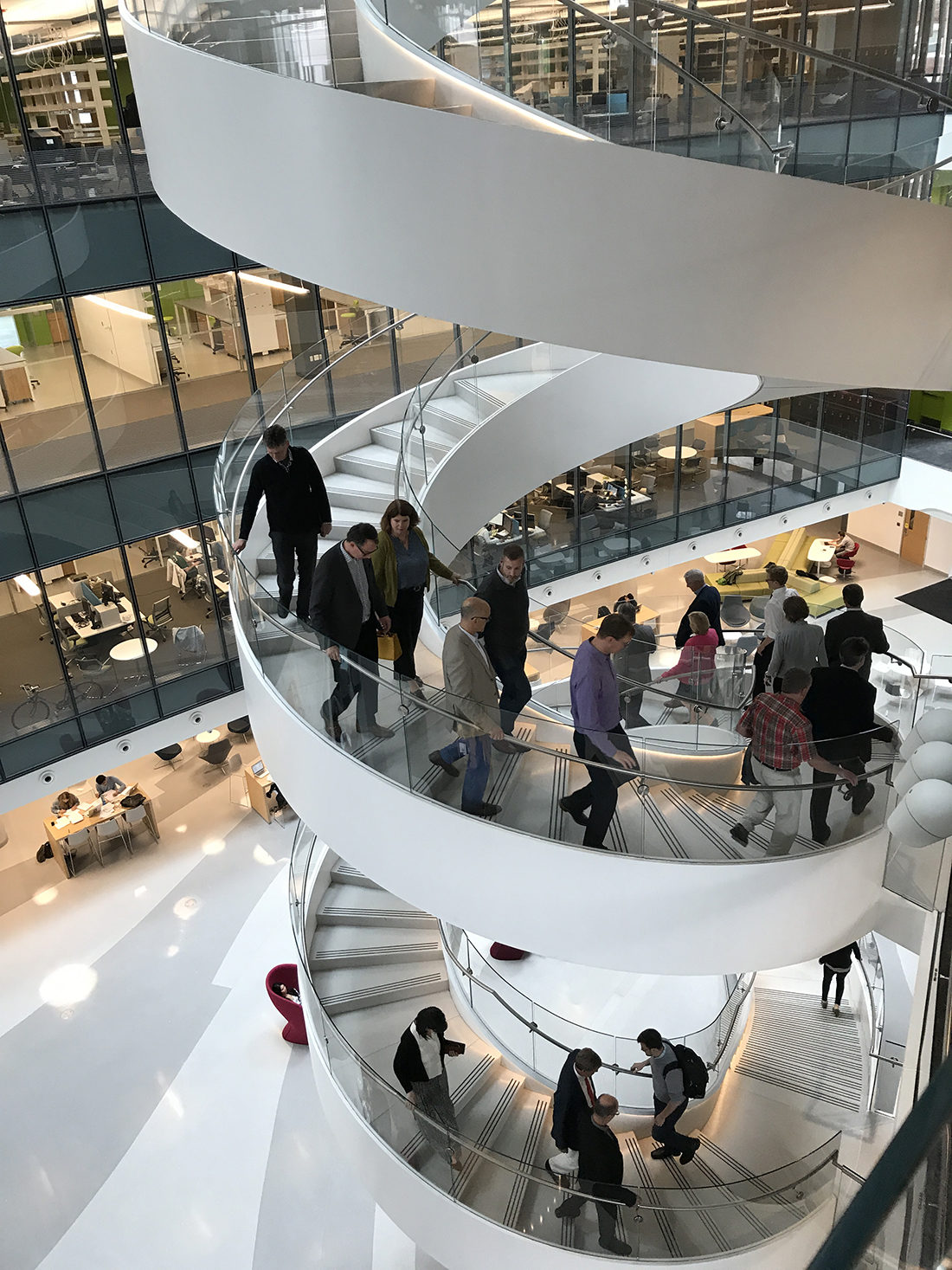 What better site than our new building at Northeastern University, the Interdisciplinary Science and Engineering Complex? It’s got a beautiful and spacious atrium, an enticing spiral stair and showcases one of our specialties – lab buildings.