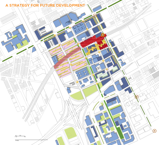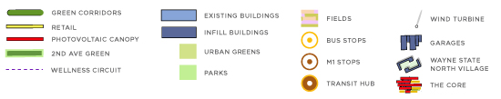 Successful innovation districts are not comprehensively designed from the outset; they mature over time, taking advantage of emerging local talent pools and evolving business clusters of excellence. Nexus, a plan to create an innovation district in Midtown Detroit, focuses on proximity, talent growth, culture, and urban density – qualities intensely destabilized in the wake of the city’s economic decline. The plan’s success primarily depends on two attributes: (1) providing an initial complement of facilities, infrastructure and branding to implement a healthy and attractive cluster of innovation, and (2) pre-wiring the district to accommodate future development, the nature of which is unknown at this time. Adaptability to changing needs is an essential feature required of successful business and innovation districts across the country. Growth is organic and non-linear. Nexus avoids the common tendency to over-prescribe the physical and programmatic structure at the outset, and relies instead on a minimal initial armature and an organic pattern for growth.