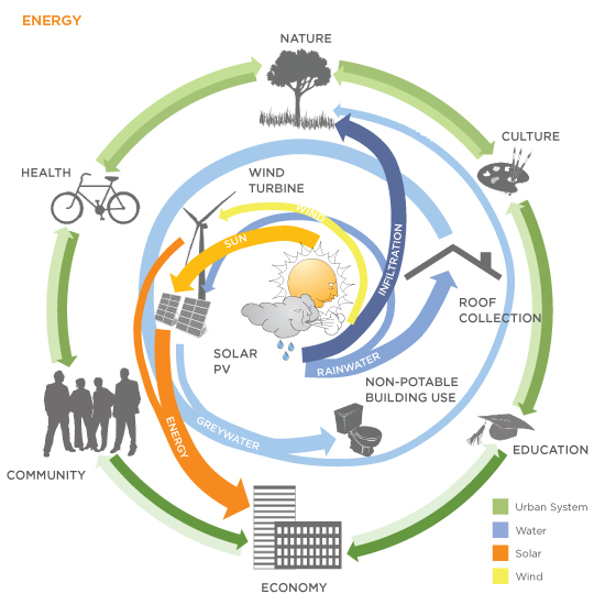 Nexus adopts the 2030 Challenge for Planning and aims to dramatically reduce energy and water consumption through an integrated strategy involving the targeted removal of inefficient structures, infill of high performance buildings, and the generation of renewable energy through solar array and wind farm. Nexus will decrease total district energy and water usage by 5% while increasing the total building gross area by over 40%.