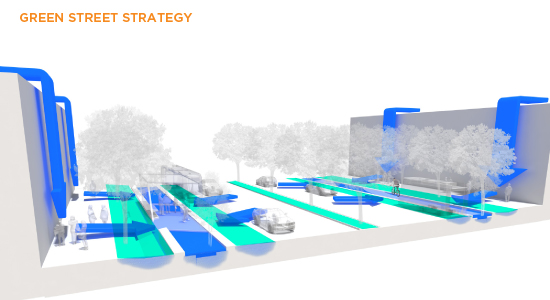 High-performance streetscapes of the Nexus district replicate the natural hydrologic cycle by creating an urban swale that will manage storm water volume and improve water quality, providing ve getation that will reduce heat island effect and capture atmospheric greenhouse gas through biological processes, and introducing biophillic connections that bring nature to the community.