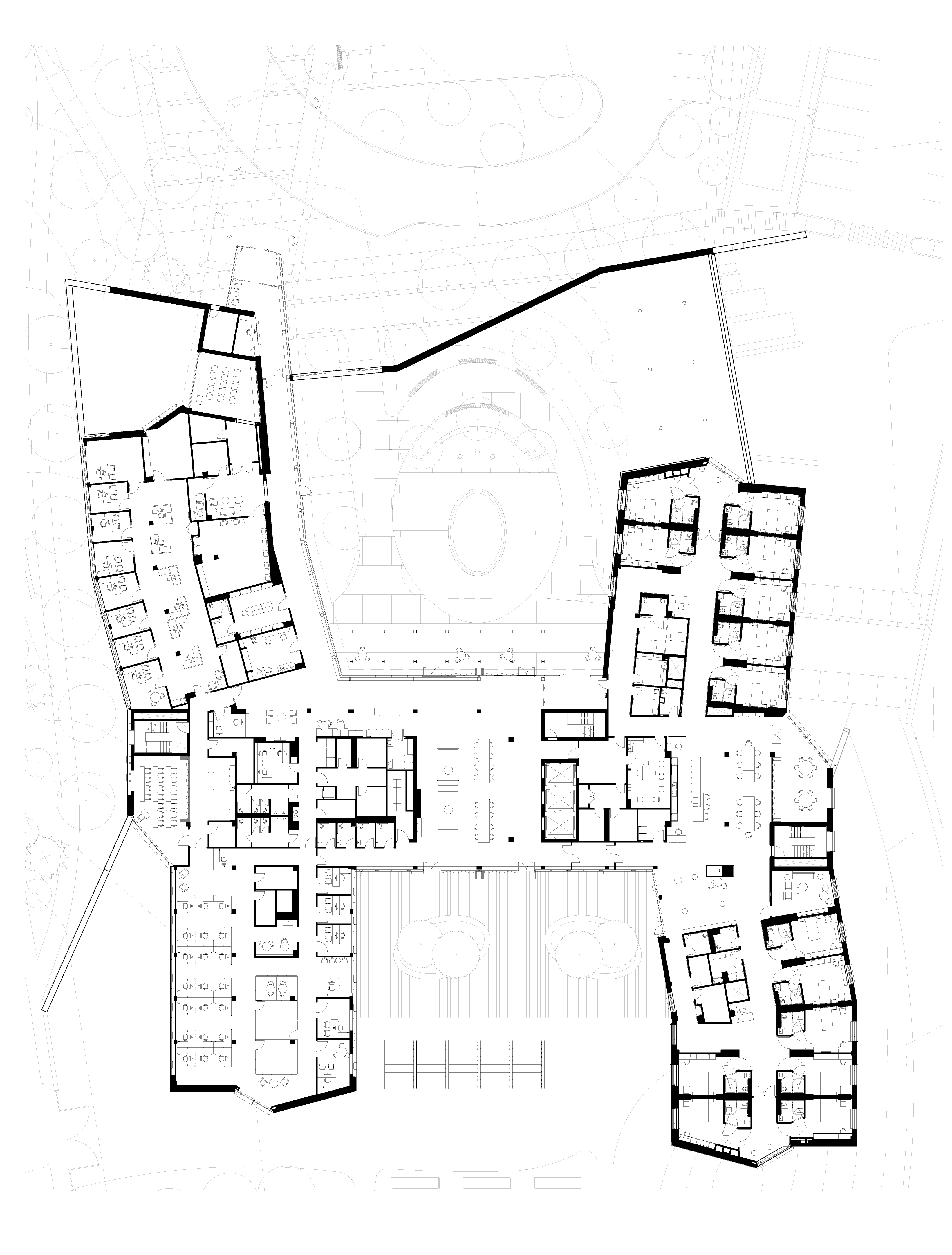 The ground level programing will serve the entire veteran community. There is a large community room that can open to outside space providing a large ceremonial space. Other public areas include a café, library, chapel and community store. This diversity of spaces meets the intent of the Small House Model by allowing the veterans to engage in a range of public activities. Special attention was placed in providing ceremonial spaces to support the veterans strong tie to military service. From the entry sequence to the two-story gathering space at the top of the building, Chelsea Soldiers’ Home is a place that Veterans and their families can be proud of as they are of their country and their service.