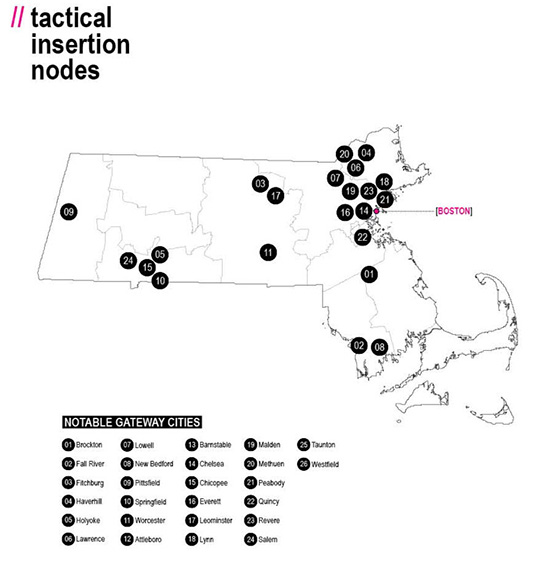 Mapping suggesting the scalability of the project through the tactical insertion nodes across the gateway cities of Massachusetts