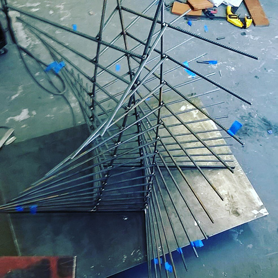 As a method for testing the feasibility and implications of our deployable system, the team developed a full-scale prototype for one of the scaffold typologies. In the same way the system redefines the contested site through deployment and program, it was important that the prototype, as an object, reinterpret the site through materiality and form. Complex helical geometries are achieved through the sawing, bending and welding of commonly used reinforcement bars. Through fabrication, these new forms begin to develop a tectonic language that can be applied to the other eight installation typologies.