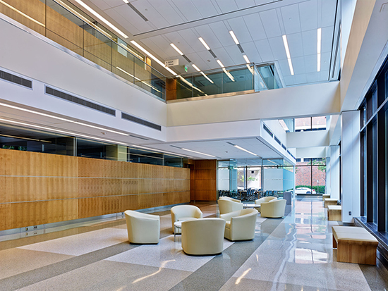 Joel Blackstock of Williams Blackstock Architect, the associated architect, said of the project, “We essentially took a can opener to that bland brick box and refitted with a glass-enclosed, two-story lobby.”