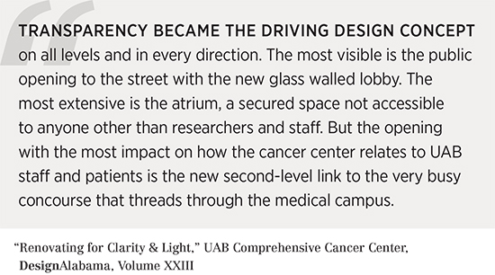 The most recent issue of DesignAlabama highlighted University of Alabama Comprehensive Cancer Center in their feature, “Renovating for Clarity & Light.” The article explores the enhanced visibility of the center as well as the transformation inside the building, which brings transparency throughout the building.