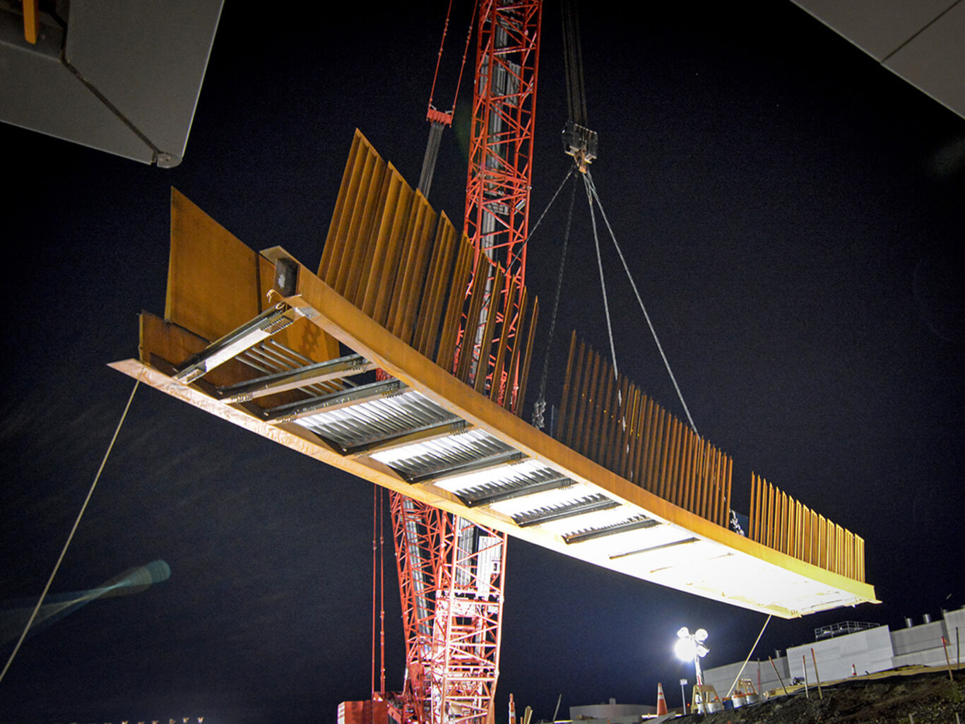 As the Manitowoc MLC-650 crane hoisted the main span off the ground, the audience was hard-pressed to stay in their seats and we left the auditorium to view the action from the adjacent plaza.