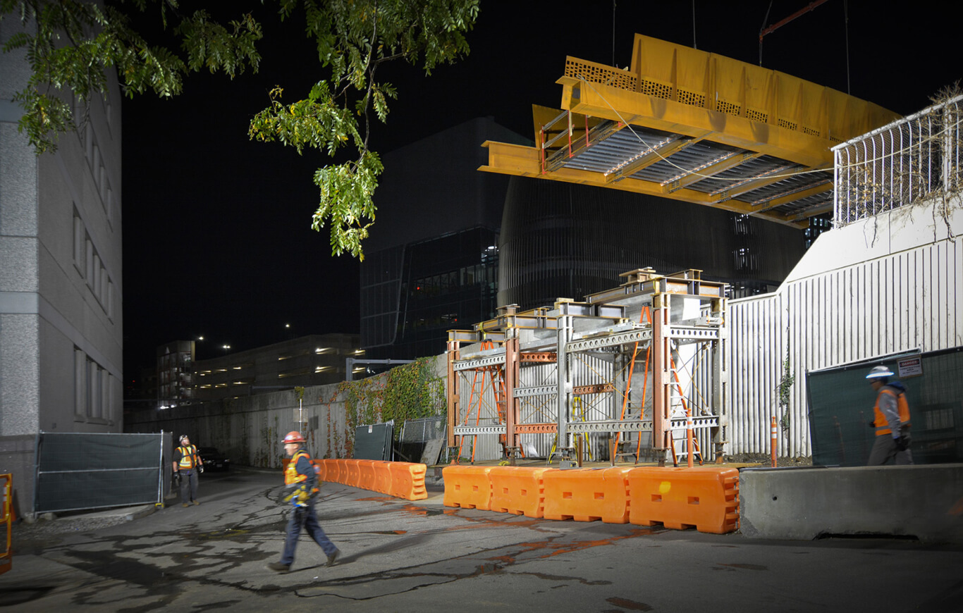 The Amtrak catenary wires and MBTA third rail powered-down while the main span was lifted, rotated and oriented adjacent to the tracks. As the bridge moved over the right-of-way, the observers cheered – this was a ballet performed with 242,000 pounds of steel. From our vantage on the roof of the adjacent Egan Engineering building, the PAYETTE design team was awed by the significance of this moment. This is more than just a piece of infrastructure; this bridge is a symbol of Northeastern’s commitment to innovation and a catalyst for the research community that calls this neighborhood home.