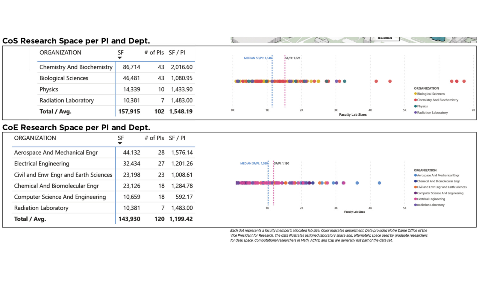 The Master Plan for science and engineering targets key deficiencies between Notre Dame’s space and peer institutions and advances key initiatives in each College. Extensive outreach and engagement with departments, students, graduate researchers and the office of the VP of Research established goals and priorities for campus improvements. An interactive survey provided detailed feedback about the priorities and patterns of use across College buildings.