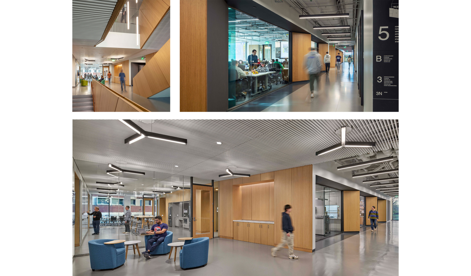 The center of the plan’s three distinct bars houses the research engine—a flexible high intensity loft with seven bays of flexible lab space per floor. In total, the thirty-five research modules accommodate wet, dry, computational and robotics labs across thematic groupings spanning aerospace, civil and environmental, architectural and acoustic engineering disciplines. The flexible loft provides lab support infrastructure, modularity in planning, and most importantly equal opportunities for visual and physical access to both exterior walls and interior circulation and presence.
