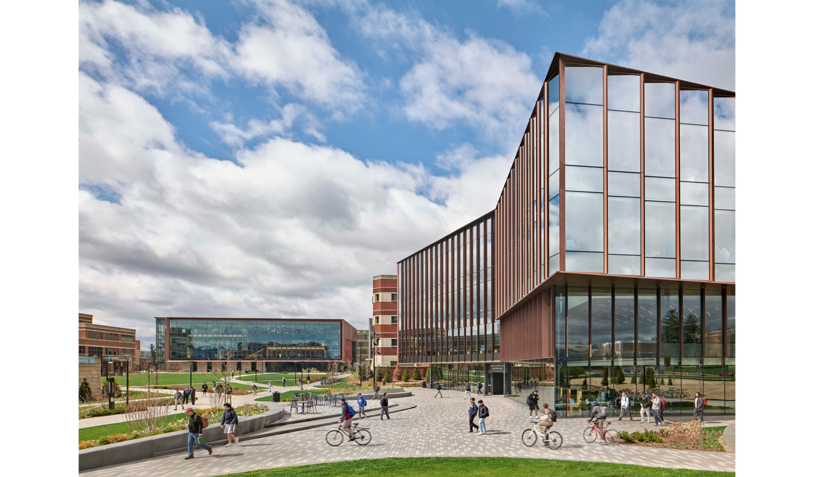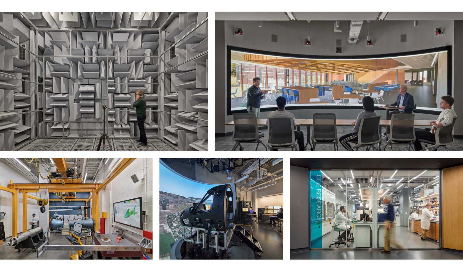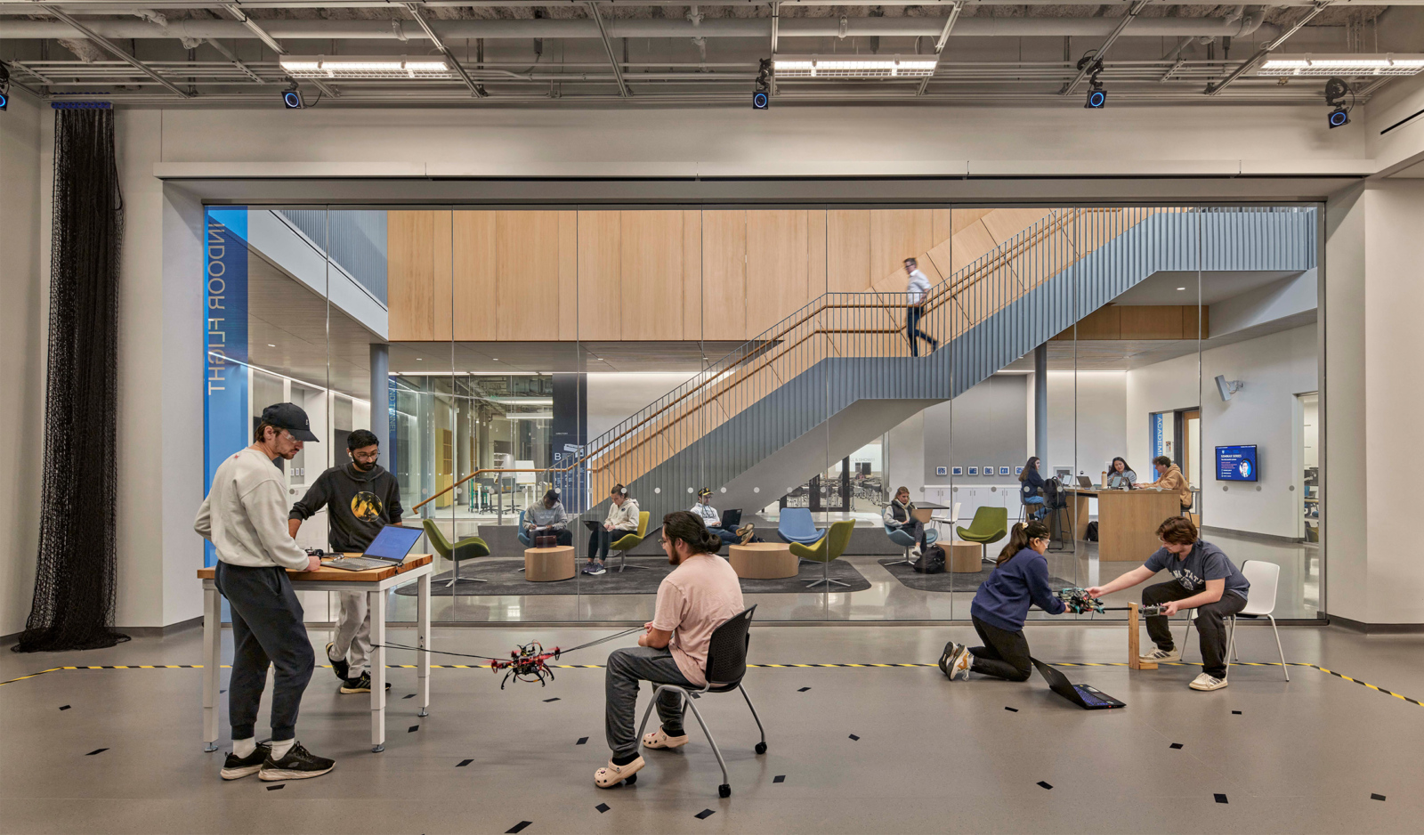 Connecting five floors of robust engineering, the Vertical Commons serves as a front door for the College and projects an invitation to all. With four floors above grade and one set into the ground below the plaza, the Commons uses open study spaces of varying size as a thermal blanket, daylight moderator and visual beacon. Housing the living room, café, student services and high-volume classrooms on the lower floors, the intimacy of public space and intensity of the engineering programs increase as one moves both up and down. Low vibration spaces below grade enable specialty core research facilities including anechoic chambers, wind tunnels, flight simulation, structural labs and a 27,000 cubic foot roto-craft ice testing research facility.