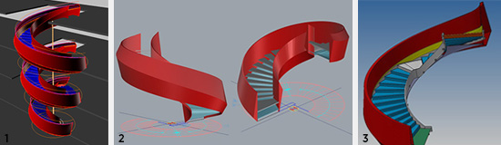 The stair underwent many design iterations before a final profile was reached. In its earliest stages, each flight of the stair had a unique radius and profile, most similar to the logo itself (image 1). As the stair developed, the radius became the same for each flight and the profile changed shape as it spiraled from the bottom floor to the top (image 2). In the end, the profile of the inner curve became rectangular and the outer curve maintained a continuous beveled profile (image 3). While the profile underwent many variations, the design intent was always for the stair material to be a continuous, solid surface. For that reason, Krion – a solid surface material manufactured by Porcelanosa – was chosen because sheets of the material can be thermoformed into curved pieces and then seamlessly welded together to create one continuous smooth surface.