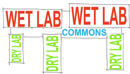 The building is organized into five building elements; two laboratory wings tucked into the hillside along the east edge of the site, and three pavilions set in the landscape to the west. The lab wings and pavilions open to a glass enclosed atrium space, nicknamed the Commons, which promotes a community of science and is a destination for the entire campus. The Commons is then tied together by a symbolic unifying element of a floating roof.