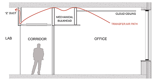 Air transfer is part of the overall mechanical air strategy and is implemented through architectural detailing. The strategy is a passive transfer, as air will naturally move from areas of high pressure to areas of lower pressure. For example, air will move from the office and classroom spaces to the atrium and laboratory spaces. The transfer details embodied three goals: 1.) execute without the use of any mechanical equipment, 2.) architecturally conceal the locations of transfer air and 3.) maintain the desired acoustic separation between spaces. Acoustically, if we merely provided a transfer grille on each side of a wall, the design would not satisfy the required sound rating. Integrated designs were achieved by transferring air through architecturally perforated wall panels and through reveal details. Furthermore, the acoustic demands required new methods of transfer that varied throughout the building. Transfer was executed by using “Z” ducts in walls, concealed acoustical lovers, and through utilizing mechanical bulkheads as sound buffers.