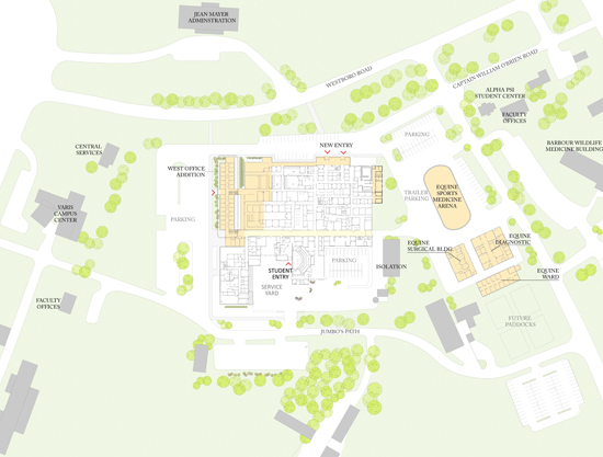 PAYETTE envisioned a comprehensive master plan for TCSVM that plan respects the status of the campus as a Massachusetts Register historic site; the proposed layouts and compact designs maintain the site’s pastoral context. The master plan also addresses the need for sustainable building infrastructure, and considers the site constraints, parking and circulation impacts of the proposed facilities. This hospital master plan intends to establish – on the conceptual level – the size, nature and general layout of future clinical and academic department space needed to support the patient caseload and clinical teaching model in small animal and equine medicine/surgery for the next 30 years.