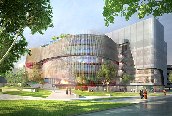 The architectural expression responds to this site’s unique forces of connectivity and integration that extend the connected landscape of the campus across the tracks, gathering multiple campus paths together with the street patterns to the south. This collection and channeling of tributaries (similar to a watercourse) has been visually interpreted in the organic forms of the building, the arc shaped pedestrian track crossing and the landscape development.