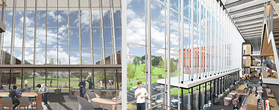 The building design is organized by two main axes with social spaces running alongside. The social hubs interconnect and create relationships between program elements and vary in scale according to the needs of the occupants. The main social space is where the two main axes intersects and is defined by a four story atrium.