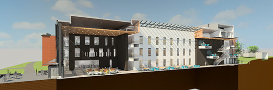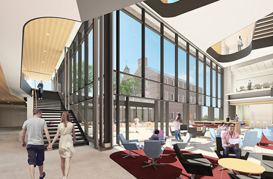 The design of the building is formed around the distinguishing social hub – the Commons. In order for the Commons to serve as a successful social hub at the campus scale, the landscape design has been strategically integrated into the project.