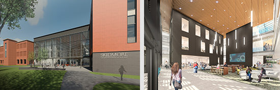 Central to much of our work are social hubs – spaces that function as vibrant, shared public realms. A light filled space or center atrium connects all main circulation spaces, such as conference rooms, lounges, lunch areas, study areas or classrooms. A social hub is often a building block for creating a cultural and academic heart. Social hubs run throughout our work – from our past to our present. Here we compare three social hubs we’ve designed for our on the boards undergraduate science buildings at Skidmore College, Lafayette College and Amherst College.