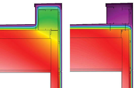 THERM Simulation of parapet: insulating around (left) versus insulating under the parapet (right)