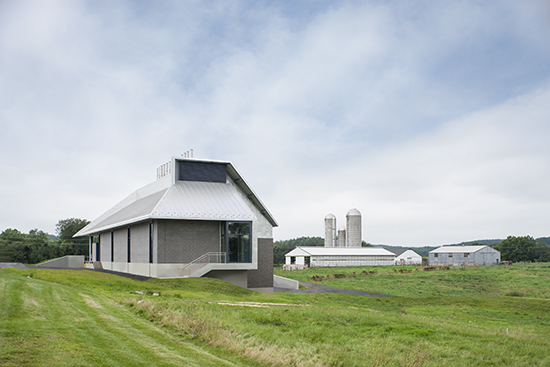 The Pell Laboratory is sited within a cluster of animal research facilities on the Ag Campus of Pennsylvania State University, set within the rolling agrarian landscape of central Pennsylvania. The vernacular landscape surrounding the site contains several simple rectangular barns capped by zinc clad roofs and silos that frame the horizon. The Pell Laboratory builds on these simple traditions, but with an attitude that reflects the cutting-edge program. The Pell Laboratory’s most distinctive feature is its undulating roof form, which houses a complex array of mechanical systems and provides a dynamic silhouette against the tree-lined horizon. The zinc clad roof form collects the twin bars of concrete block laboratories that straddle a central circulation spine framing dramatic landscape views at each end.
