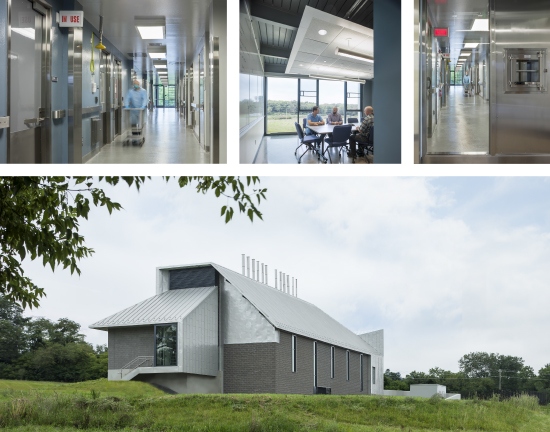 We had a lot of fun designing this project because it challenged both our technical and design expertise due to its relatively small size, highly unique site and program. The Pell Laboratory houses some of the most cutting-edge infectious disease research in the world in a “BSL-3 Enhanced” biocontainment facility where scientists study aerosol and insect transmitted diseases such as H5N1 (Avian influenza), Yersinia Pestis (Plague) and Tuberculosis as well as insect transmitted virii such as West Nile Virus and Francisella Tularensis (Tularamia), in a safe and secure research environment sandwiched between two interstitial mechanical floors. The highly specialized and technically demanding program was both challenging and wonderful to work on. It is not often that we get the opportunity to design a self-contained BSL-3+ stand-alone building, much less one located in a cow pasture surrounded by barns. PAYETTE has designed many BSL-3 environments, but never a whole building dedicated to BSL-3 research.