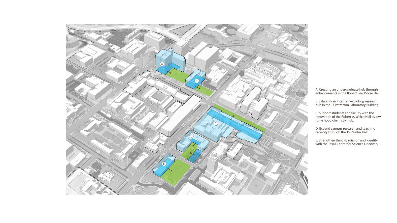 Established in 1970, the College of Natural Sciences is the largest College at the University of Texas at Austin and one of the largest colleges of science in the United States. The College commissioned the Master Space Plan to set strategic priorities that are consistent with the University’s Campus Master Plan and Strategic Plan. The Master Space Plan recommends a dual initiative to transform the College from a department-based organization to a program-based organization. It identifies priorities, timelines and specific occupancy plans for renovation and modernization of the College’s existing stock of teaching and research facilities. The plan treats the constraints of existing buildings as opportunities and maximizes multidisciplinary collaboration.