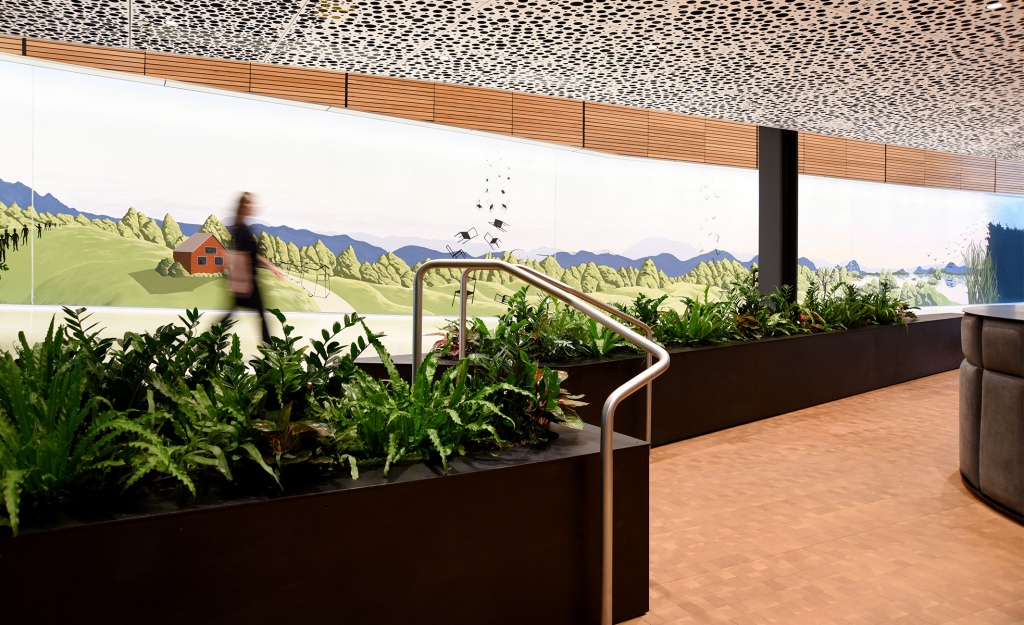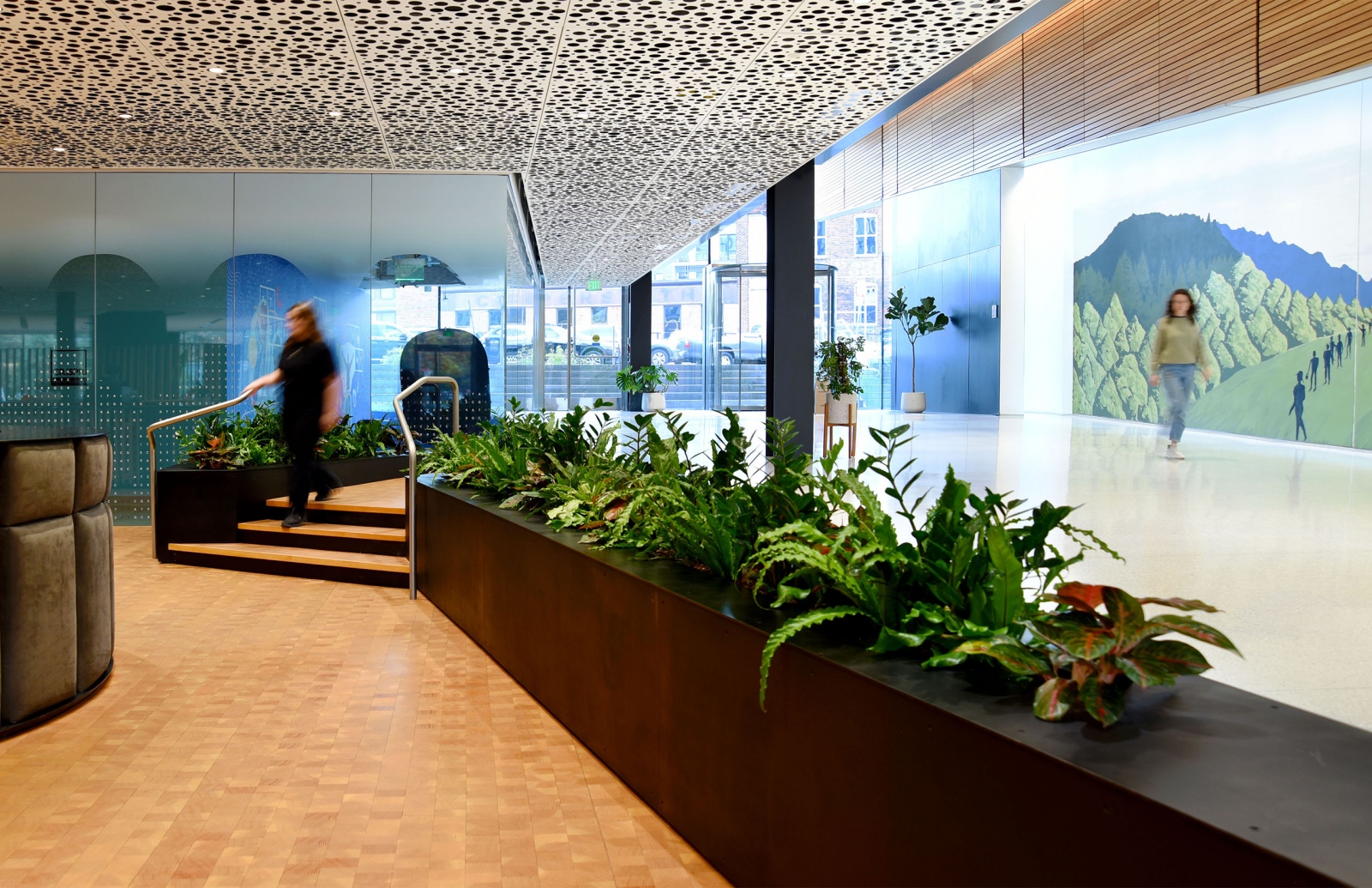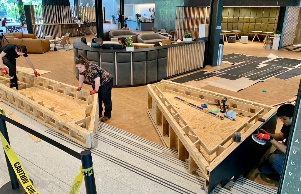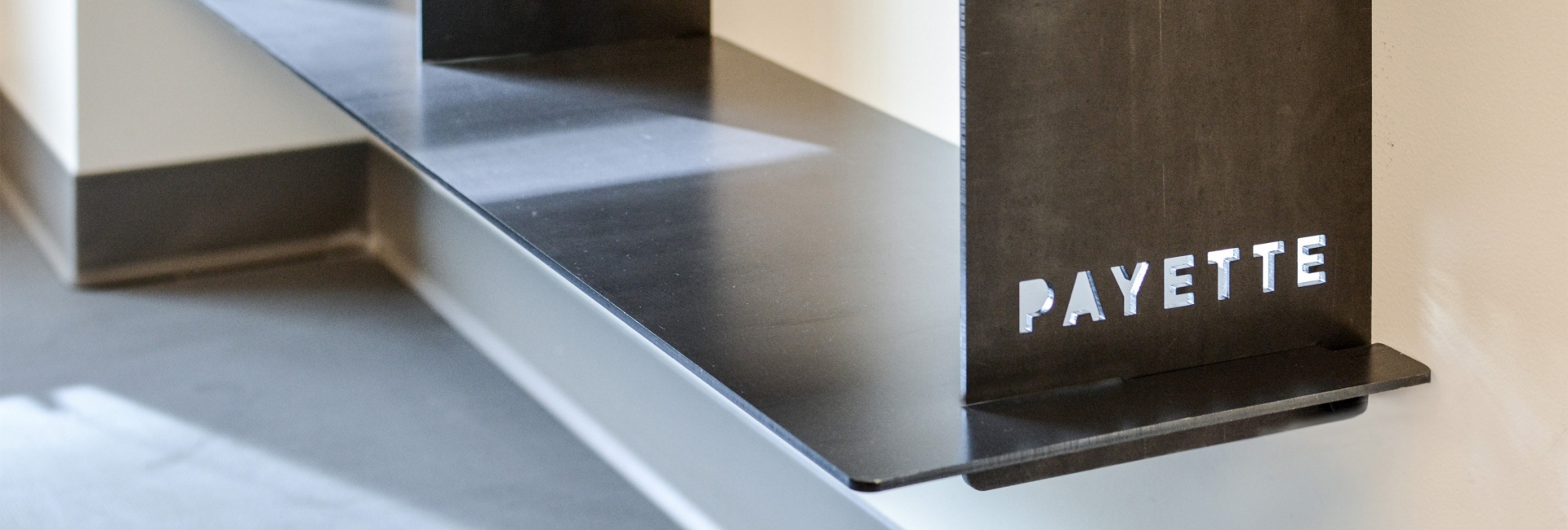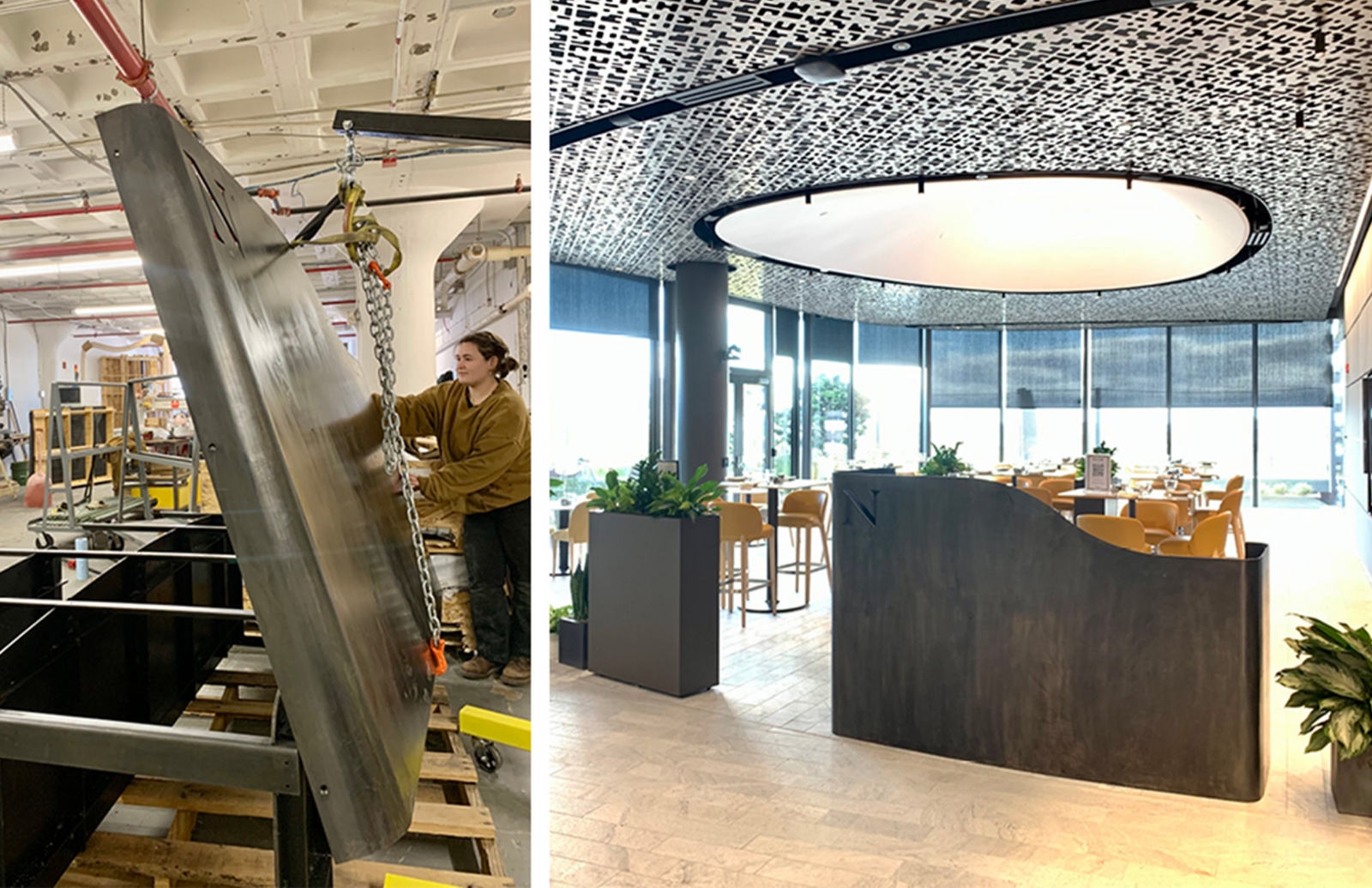 PAYETTE’s fabrication team completed the installation of custom planters at The 105 by Breakthrough. The intent was to modify the existing lobby circulation to better meet the tenant’s needs. The geometric shapes and the material selection of the objects respond to the space’s existing built-in furniture. The planters were fabricated in-house and installed by the fabrication team. The new stair between the two planter sections was later built by a general contractor. The final product is filled with lush greenery and successfully meet the client’s needs in this public lobby.