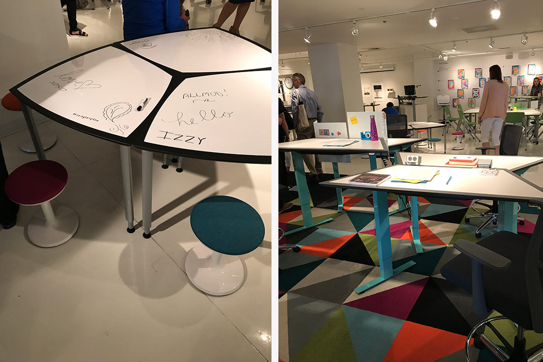 Ritz Associates toured us through the Izzy show room, which drew us in with its playfulness and buzzing energy. Izzy was inspired by spaces where people connect and learn. They created an approachable and unique space that pairs modern furniture pieces and a lively pallet. The colors were bright and complimented by bold graphics. The bold color and fresh furniture in the showroom really came alive to create a spirited and uniquely “Izzy” space.