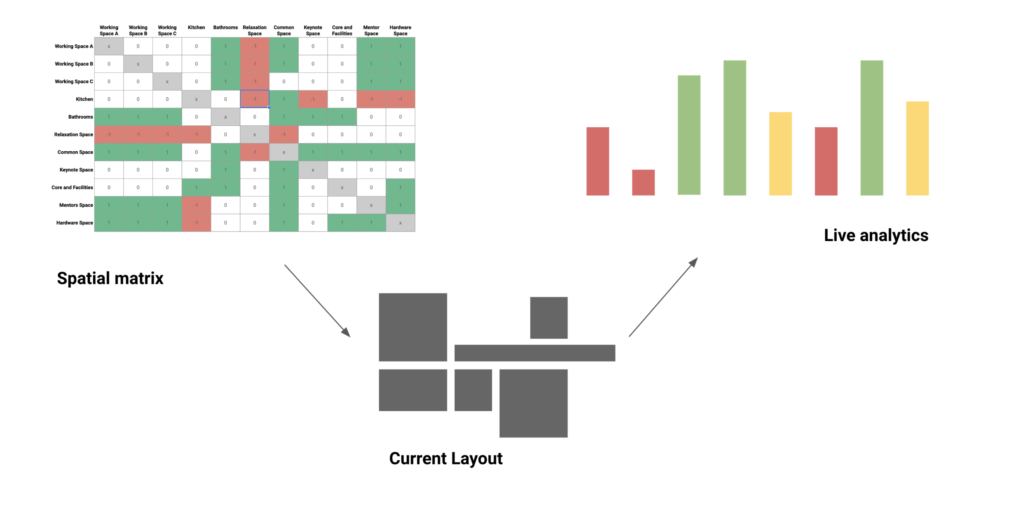Our app opens showing a grid plane populated with space blocks. Each block corresponds to a space type and has a floating tooltip above indicating the space name and area to allow for immediate understanding of space data. Users are then prompted to rearrange the blocks within the grid. If a space block is dragged off the grid, handles appear that allow the user to scale the object in the X or Y direction, while the tooltips update the modified space data “live.” New spaces can be added to the grid using a floating tool bar which holds a collection of alternative space types. Additionally, a bar chart hovering just beyond the grid shows ideal adjacencies and as you move and scale spaces, it displays the score of the different space types as they relate to their immediate surroundings. Finally, the history of all interactions is recorded digitally, and using a slider, all previous configurations and positions of the space blocks can be accessed and played back at any time.