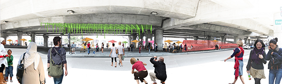 The area under the I-93 overpass sits at a nexus point between four very different neighborhoods – each comprised of diverse populations. By nature the space is transient; there’s no real there there – it’s a gateway to separate neighborhoods, but also a parking lot for area events, businesses and apartment buildings. In its current form, the site is not a destination. And there are good reasons for this. Firstly, it’s dark. Secondly, it’s loud. Ambient traffic noise from the surrounding onramps and exits create a cacophonous symphony of road noises that’s hard to ignore. It’s also industrial and utilitarian by design. The physical space of the underpass was not created to be a valuable community space – in the existing condition, it is an unavoidable byproduct of the elevated highway.