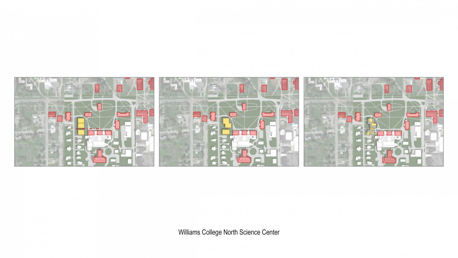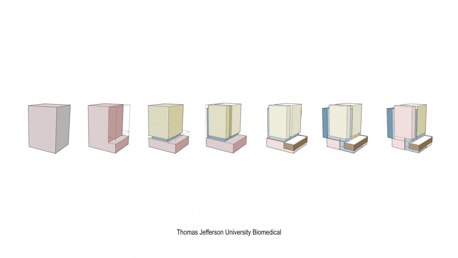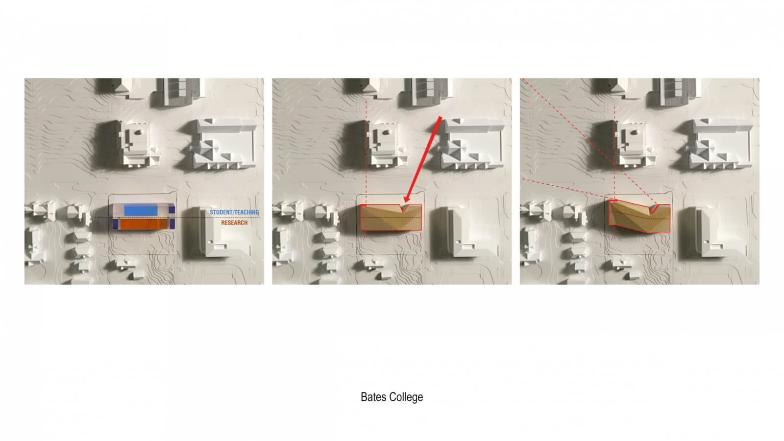 At the scale of the campus, Williams College Science Center considered the surrounding building fabric and campus connections to evolve the building massing; separating the three programmatic departments into separate masses, shifting them to break down scale and relate to the surrounding fabric, and ultimately linking them together through a series of interior social spaces that take advantage of the buildings’ site at the western edge of the main quad. At the scale of the site, the evolution of building form for the Bonney Science Center at Bates College, from programmatic massing to the ultimate geometry, is evident through a progression of direct responses to specific site conditions. At the scale of the building, massing diagrams for the Thomas Jefferson University Biomedical Research Building utilized a linear progression to simplify the complexity of the multi-faceted form.