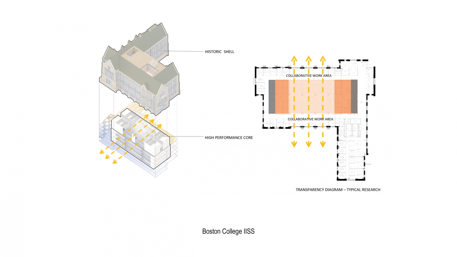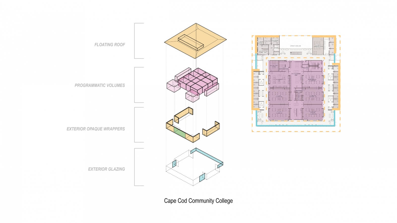 We also rely on the diagram to clarify design moves. Cape Cod Community College for example is comprised of a series of smaller architectural operations. The assembly diagram clarifies each part. For the Schiller Institute for Integrated Science and Society at Boston College, the diagram is used to identify the link between seemingly disparate elements of a collegiate gothic façade and cutting-edge high performance interior program.