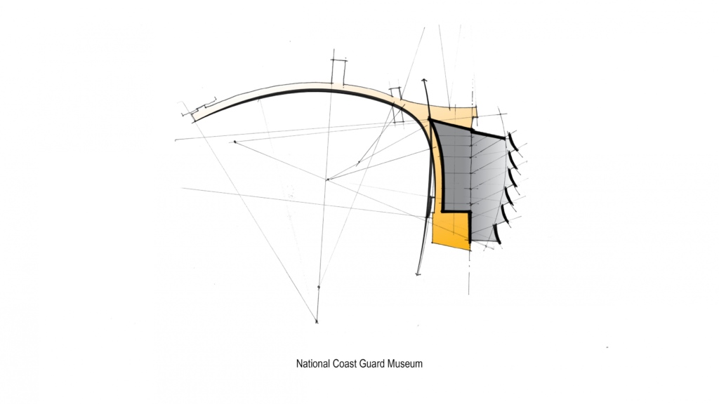 For the National Coast Guard Museum, Diagram is used to not only articulate the geometry of the sails along the water but also to illustrate the relationship between the museum gallery and the public armature that reaches back towards the railroad tracks and into the surrounding context.