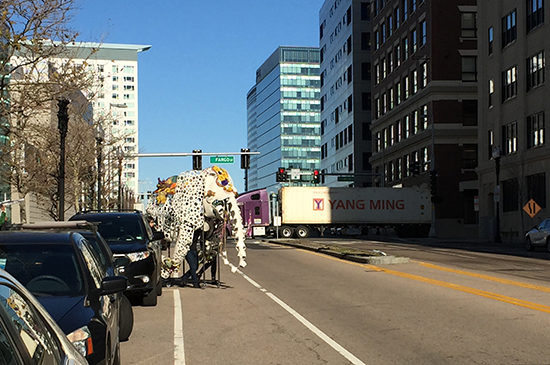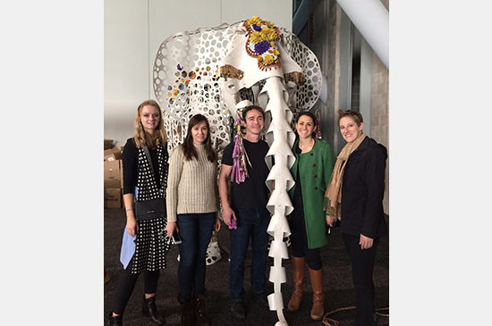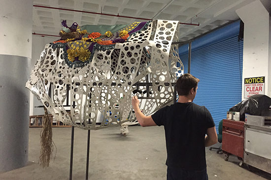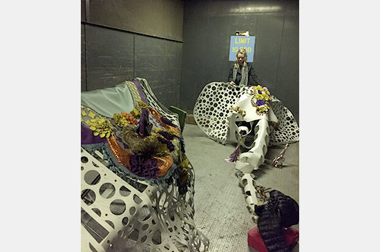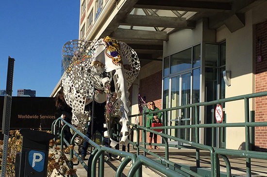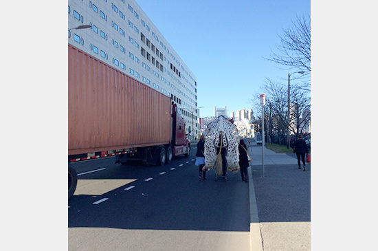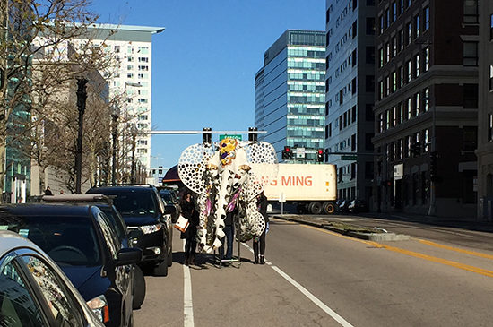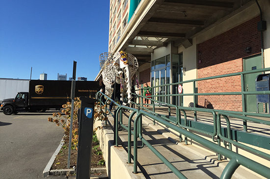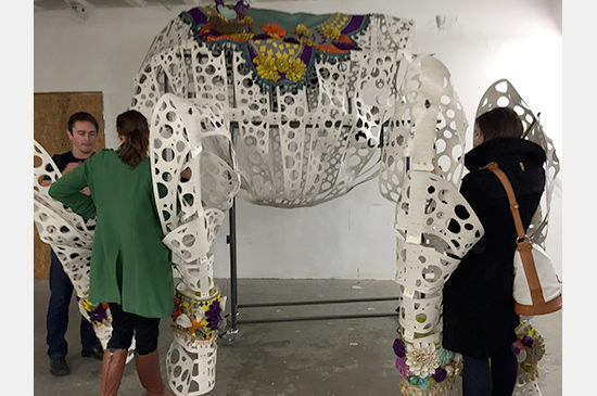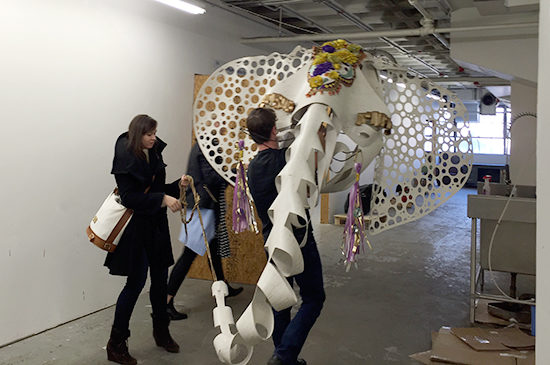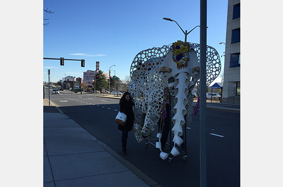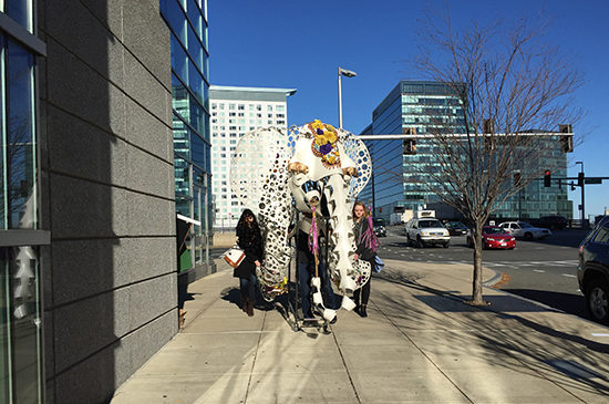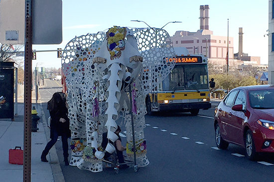 We’re thrilled to include ‘Pearl’ on the expo floor at ABX this year! ‘Pearl’ was just one element in our IIDA New England Fashion Show entry, albeit the largest. Yesterday we walked Pearl from our fabrication annex to the expo floor at the Boston Convention and Exhibition Center.