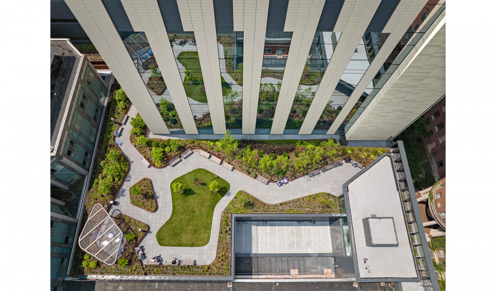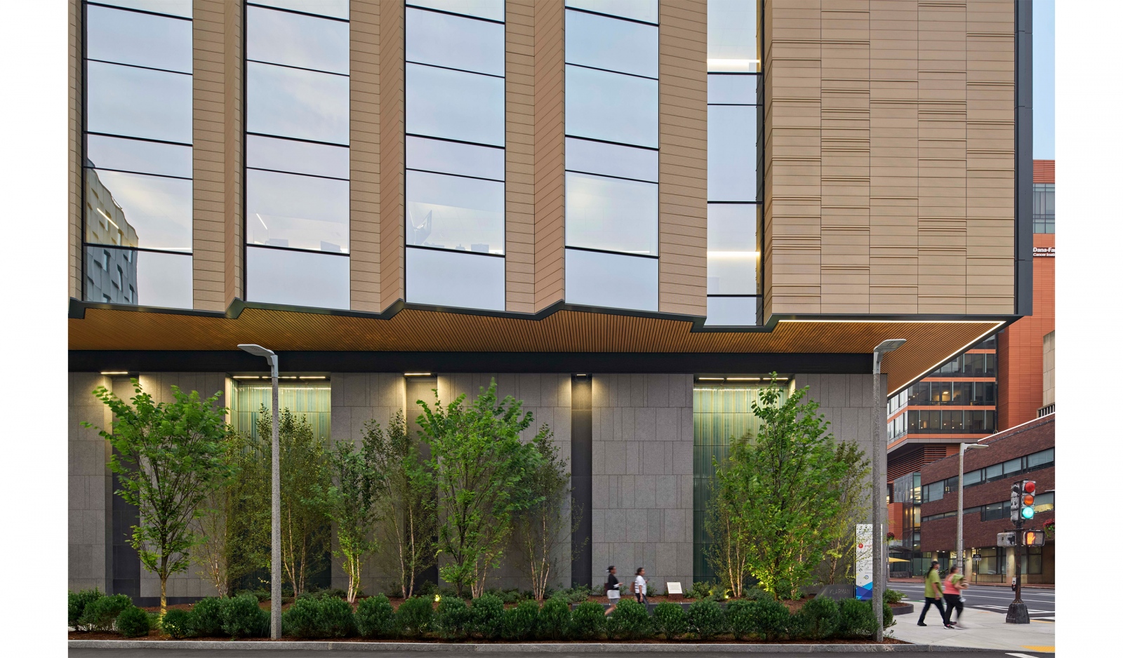 The building façade is comprised of “tuned serrations” – angled projections which are oriented to achieve the most optimal solar radiation exposure to reduce peak energy demands on the building. The serrated façade allows the inpatient room window size to be maximized for daylight and views while decreasing the overall energy demand of the building. The Klarman Building was designed to bring elements of nature to patients, visitors and staff – from views to the adjacent green space, a rooftop healing garden and by implementing a material and art palette inspired by the urban green spaces of Boston’s neighborhoods. The resulting building synergistically fuses its healthcare planning with high performance features to create an innovative space for healing.