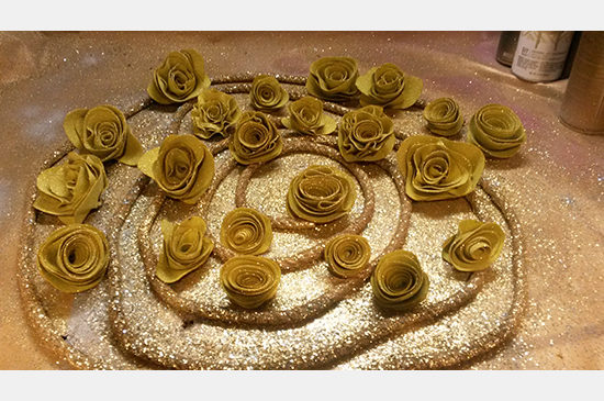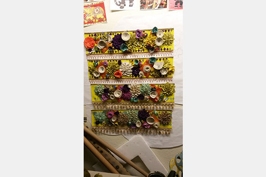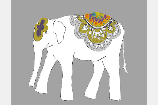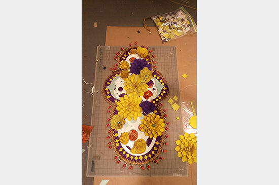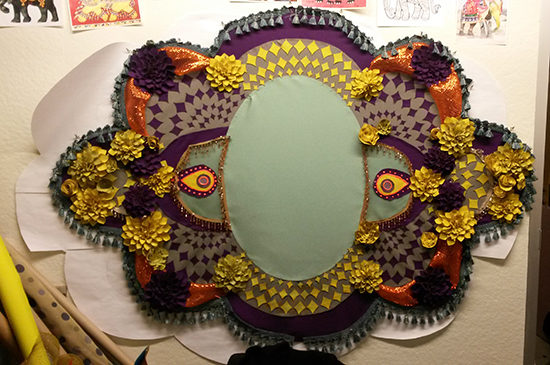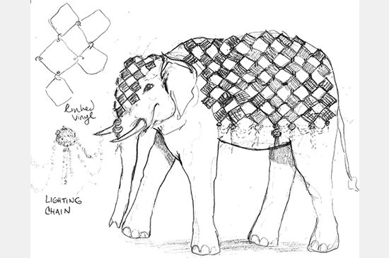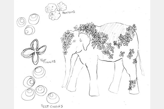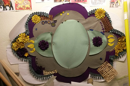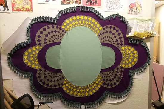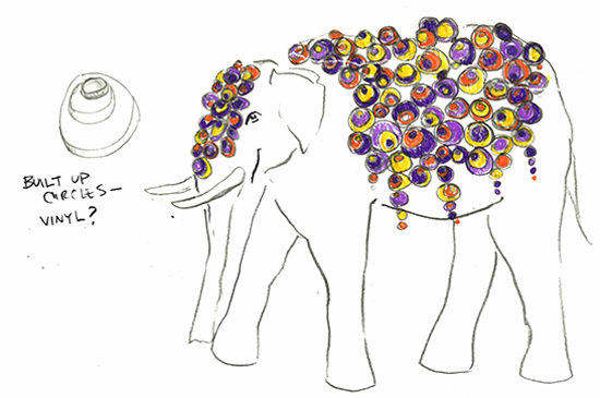 The elephant accessories team was approached with an interesting design problem: what does an elephant wear? In keeping with the overall vision of project, we identified that the costuming should be elegant, beautiful, intricate and complimentary to an elephant structured of vinyl flooring. Our finished design features a blanket, headpiece and four ankle decorations which are studded with fabric flowers. The elephant decoration came from the synthesis of two ideas: I envisioned repeated 3D objects, while Amber and Loren explored the aesthetics of traditional Indian elephant decorations. The final design was a synthesis of these two ideas. We used the filigree and visually complex detailing of the traditional patterns, combining symmetrical patterns with organically arranged flower bouquets.