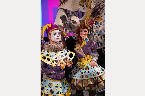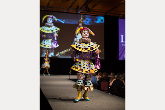 The body of the jester’s hat was created out of the same upholstery materials as the clothing. The team then added a Lumicor crown and ornamental balls made from strips of Lumicor.