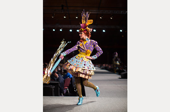 Leading Pearl the Elephant onstage was our circus master and jester. Despite limited rehearsal time, the energy of the audience and the perfectly timed music made their debut a breeze. But long before their appearance, a busy team worked hard on their runway attire which needed to have both exquisite form and high functionality. The initial designs were based on vintage circus costumes. Our talented seamstress Deb kept busy on weekends making patterns, sewing mock-ups and producing the final pieces. A big challenge was working with upholstery fabric, which does not stretch or move like clothing fabric. Our team had to be clever about creating extra tolerance in the joints so that our models could move gracefully on stage, while still maintaining the fitted look of jackets and leotards.
