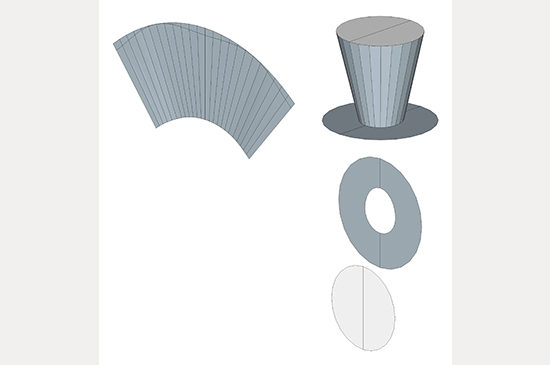 The circus master’s hat started as a paper template that was further refined in Sketchup. Two team members – Hilary and Rashad – envisioned a petite and playful hat that was a stunning showpiece. After experimenting with different materials, they found Lumicor curled nicely after being laser cut, which gave them the whimsical shape they were after. Lumicor did not accept glue very well, so their solution was to sew the hat together via laser cut holes. The crisscrossing stiches added great detail to the edges. The hat was finished with a large bouquet of dried natural and foil materials from Lumicor, giving it height and texture. The natural materials were used to make the circus master’s wand, designed to attract the audience’s attention with big movement and shine.