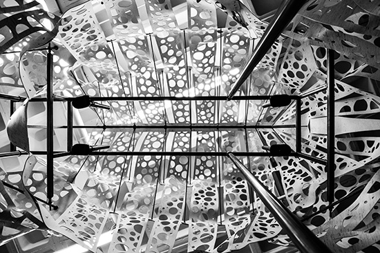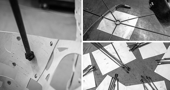 Every detail was modeled in Rhinoceros, including the steel skeleton and fasteners. The surfaces of the skin were unrolled and a circle-packing algorithm was used to populate the perforation pattern. By digitally simulating the assembly logic, the fabrication process was streamlined and error free.