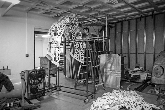 As the vinyl flooring is draped over the spoked ‘rib cage,’ Pearl starts to take shape.