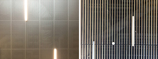 The combination of ceiling types in the SEC building make the spaces unique where users can experience different environments. Below is an example of a metal ceiling and wood slat ceiling with light fixtures integrated.