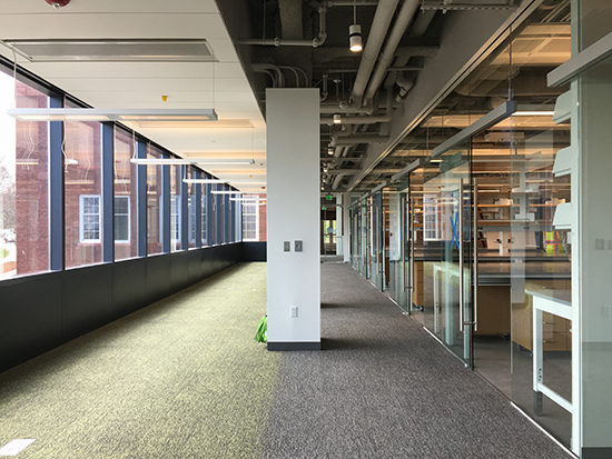 The open laboratory spaces are ready to be fit out with furnishings. The glass partition enables daylight to penetrate deep into the space and enables the laboratory users to enjoy the amazing views.